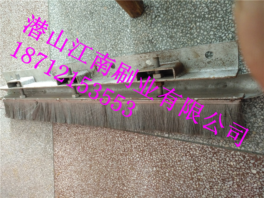 潛山江南刷業(yè)有限公司考慮到現(xiàn)場要求耐高溫、耐沖刷性和基于一般鋼絲刷的基礎(chǔ)上進行改進,設(shè)計出一種耐高溫彈性可調(diào)式鋼絲刷密封裝置,不僅解滿足決生產(chǎn)過程中密封問題,而且減少更換次數(shù),使其延長使用壽命,減少設(shè)備維護、檢修時間,提高生產(chǎn)效率和有效產(chǎn)能。使用時,先將U型槽部分焊接在煙罩外側(cè)的軌道上,調(diào)節(jié)螺母使該密封裝置的鋼絲刷的下部與燒結(jié)臺車上端完全密合即可。當臺車運行時,帶起的高溫氣流和粉塵遇到鋼絲刷部分,因鋼絲刷的密厚組合方式而無法外泄,同時因鋼材質(zhì)的物理性能可以高溫沖刷的需求,從而起到密封效果。